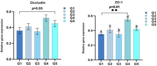 Intestinal occludin expression levels revealed no significant disparities between groups G1 through G4 and a minor enhancement in G5 (Figure 4). The subsequent graph demonstrates an increased trend in ZO-1 expression from G1 to G4 (p < 0.05).