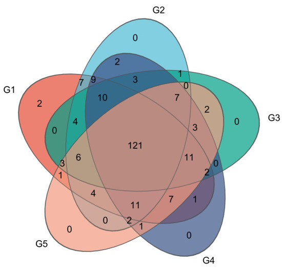 The addition of different levels of C. butyricum significantly impacted the gut microflora of triploid rainbow trout among the groups, as depicted in a Venn diagram (Figure 5). A core microbiome of 121 operational taxonomic units (OTUs) common to all groups suggests a stable microbial community across different supplementation levels. Despite different C. butyricum levels, there was no significant impact on the Chao1, ACE, Shannon, and Simpson diversity indices (Table 10).