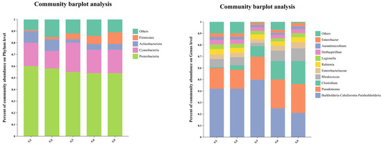 Barplot analyses showed the predominance of Proteobacteria and Firmicutes among all groups, with fluctuations in Firmicutes abundance (Figure 6). The presence of Actinobacteriota, Cyanobacteria, and other minor phyla contributed to microbial diversity. At the genus level, it illustrates a diverse bacterial community with genera like Burkholderia–Caballeronia–Paraburkholderia, Pseudomonas, and Clostridium present in different proportions across groups G1 to G5.