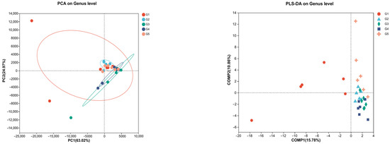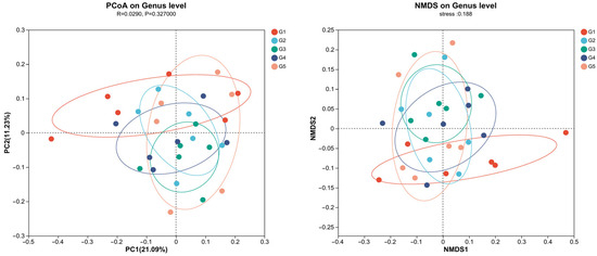 Principal component analysis (PCA) and partial least squares discriminant analysis (PLS-DA) showed distinct microbial profiles among the groups, with G1 showing a unique composition (Figure 7). This separation shows the potential of C. butyricum supplementation to modulate gut microflora at the genus level, with G4 exhibiting the greatest variance post-supplementation. Principal Coordinates Analysis (PCoA) and Non-metric Multidimensional Scaling (NMDS) revealed that C. butyricum supplementation subtly alters gut microflora without causing significant overall structural changes (PCoA: PC1, 21.09%, PC2, 11.23%, R = 0.0290, p = 0.327; NMDS stress: 0.188) (Figure 8). G1 presented a unique microbial profile, while G2, G3, and G4 showed overlapping clusters, and G5 showed greater variability.