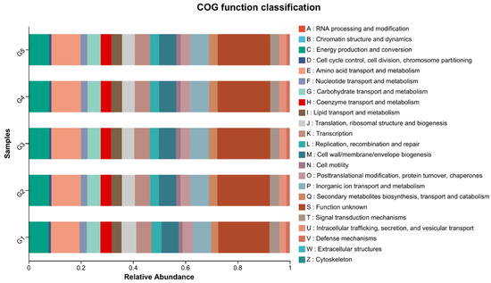Cluster of orthologous groups (COG) functional classification in triploid rainbow trout microflora influenced by C. butyricum supplementation (n = 3).