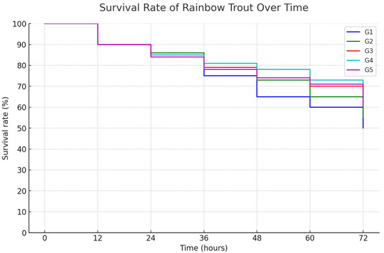 The graph presents the SR of triploid rainbow trout over 72 h after being exposed to A. salmonicida, following 12 weeks of cultivation with different levels of C. butyricum supplementation (Figure 10). Initially, all groups exhibited an SR of 100%. However, with time, G3 and G1 showed earlier reductions in survival, with G3 experiencing a more apparent decline. By the conclusion of the 72-hour observation period, G4 recorded the highest SR (66.67%). Similarly, G5 and G3 showed higher SR, with G5 achieving 63.33% and G3 achieving 60.00%. G1 and G2 exhibited SR of 50% and 53.33%, respectively.