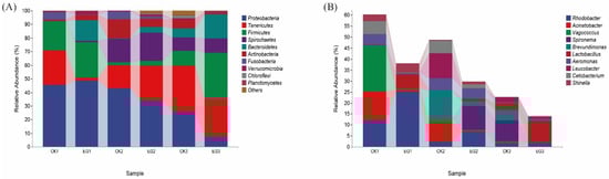 DNA extraction and PCR amplification were performed as follows: gut genomic DNA was extracted from six sample groups using the Qubit 2.0 DNA Assay Kit (Invitrogen, Waltham, MA, USA) according to the manufacturer’s instructions. The quality of the extracted DNA was assessed using 1.0% agarose gel electrophoresis and spectrophotometry, and the optical density was measured at a 260 nm/280 nm ratio. All extracted DNA samples were then stored at −20 °C for subsequent analysis. To investigate the structure and composition of the bacterial communities in the loach gut, high-throughput sequencing of the 16S rRNA gene was conducted. The V3–V4 variable region of the bacterial 16S rRNA gene was amplified using the universal forward 338/806 primers (338F: ACTCCTACGGGAGGCAGCCA and 806R GGACTACVSGGGTATCTAAT) []. Raw data were screened using quantitative insights into microbial ecology (QIIME) based on barcode and primer sequences [].