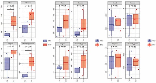 A comparison of alpha-diversity indices (Chao1, Observed species, Shannon, Simpson) of the gut microbial community in Paramisgurnus dabryanus performing at 10 days (CK1 vs. EG1), 20 days (CK2 vs. EG2) and 30 days (CK3 vs. EG3). Box plots depict the medians (central horizontal lines), inter-quartile ranges (boxes), and 95% confidence intervals (whiskers). The p-values are from the Kruskal–Wallis test. Asterisks indicate statistically significant differences between pairs of values (* p < 0.05).