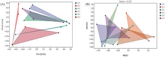 The PCoA scatterplot revealed a significant difference in population composition between the CK1 and EG1 groups, whereas no significant differences were found among the other groups (Figure 3). The two primary coordinates explained 24.9% and 17% of the total variation, respectively. Notably, samples from the CK3 and EG3 groups were clustered below the midline of the vertical axis, whereas samples from the other groups were clustered above the midline. Additionally, the NMDS analysis confirmed a significant difference between the CK1 and EG1 groups but showed no significant differences among the other sample groups.