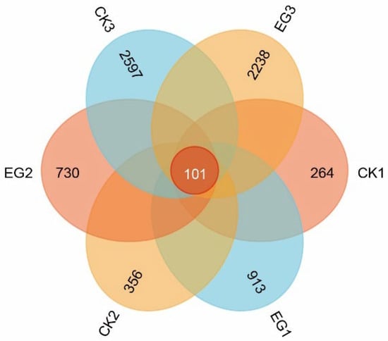 Venn diagrams were used to visualize the shared and unique amplifying sequence variants (ASVs) among the different gut sample groups, representing the core gut microbiota. As shown in Figure 4, all samples shared 101 ASVs. The CK1, CK2, and CK3 groups had 264, 356, and 2597 distinct ASVs, respectively. In contrast, the EG1, EG2, and EG3 groups had 913, 730, and 2238 unique ASVs, respectively.