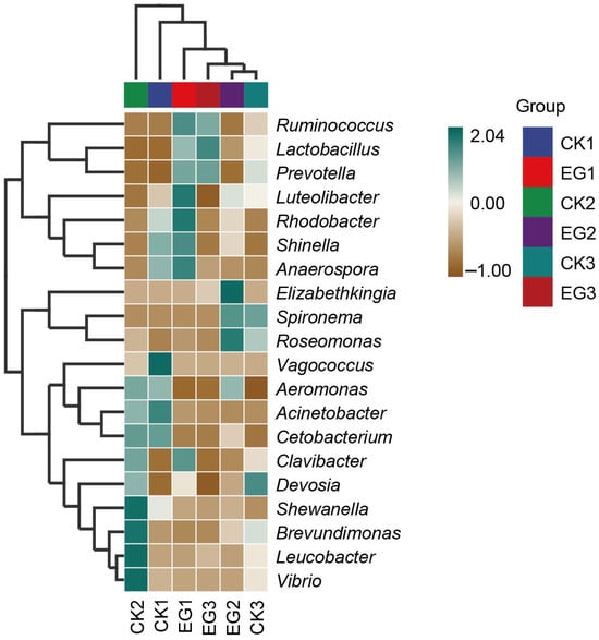To explore the genus-level similarities and differences between samples, we generated a hierarchical clustering heatmap (Figure 5). In the CK2 group, the dominant genera included Shewanella, Brevundimonas, Leucobacter, and Vibrio. Specific genera, such as Vagococcus, Luteolibacter, and Elizabethkingia, were observed in the CK1, EG1, and EG2 groups, respectively.