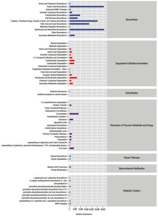 We determined the abundance of active metabolic pathways in the intestinal microbiota by reviewing various metabolic pathway databases. Amino acid biosynthesis pathways were the most abundant among the biosynthetic pathways, followed by pathways related to cofactors; prosthetic groups; electron carriers; and the biosynthesis of vitamins, fatty acids, lipids, nucleosides, and nucleotides (Figure 6).