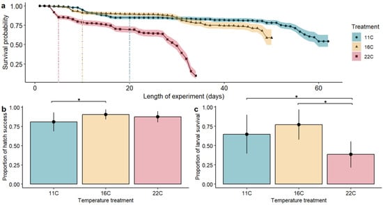 (a). Kaplan–Meier survival plot of flannelmouth sucker eggs to larvae with three temperature treatments (11 °C—blue; 16 °C—yellow; and 22 °C—red), plotted daily over the 62-day experiment. Shaded areas represent 95% confidence intervals and dashed vertical lines represent when all eggs hatched for each treatment (11 °C—20 days; 16 °C—10 days; 22 °C—5 days). Survival post-hatch refers to the remaining larvae in each treatment. Hatch success (b) and larval survival (c) for the three temperature treatments. Vertical bars represent the standard deviation. Brackets with asterisks represent significant differences between treatments .