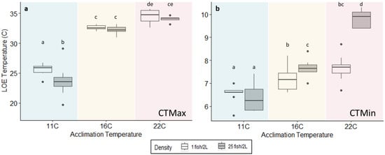 Differences in acclimation temperature and CTMax and CTMin trials indicate a difference in final LOE temperatures between all acclimation temperatures for CTMax (, Figure 3a) and CTMin (; Figure 3b). Fish density had an effect on CTMax at the 11 °C acclimation temperature (), indicating that fish at a higher density were less tolerant to warm temperatures than low-density fish. We did not detect a difference in the 16 °C and 22 °C acclimation temperatures (; Figure 3a). Similarly, fish density affected CTMin within the 16 °C () and 22 °C acclimation temperatures (), indicating that fish at a higher density were less tolerant of cold temperatures than low-density fish. We did not detect a difference in the 11 °C acclimation temperature (; Figure 3b). Different fish densities between acclimation temperatures of CTM trials also indicated a difference. Specifically, differences were detected between CTMax acclimation temperatures for both high () and low fish densities (), with post hoc analysis indicating a difference between 11 °C and 16 °C and between 11 °C and 22 °C among CTMax trials and between all acclimation temperatures for CTMin trials (Figure 3).