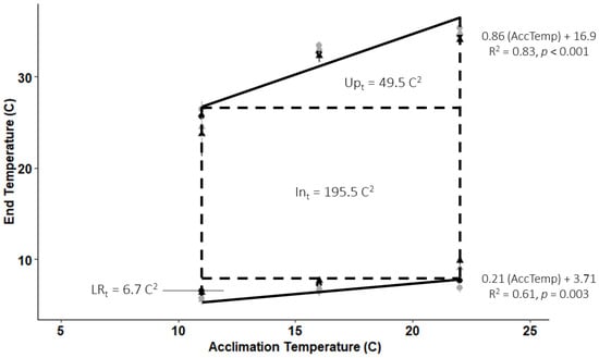 Conte et al. [24] demonstrated at least three acclimation temperatures for both CTMin and CTMax values as well as upper and lower chronic thermal limits, which are required to create an accurate temperature tolerance polygon. Thus, data from temperature trials at all three acclimation temperatures (11 °C, 16 °C, and 22 °C) were used. We did not define the chronic high and low lethal temperature ranges of the larvae, so the full acclimation scope and thermal tolerance range of larval flannelmouth suckers were not identified, which are needed to create a full polygonal temperature profile; thus, a partial polygon was created.