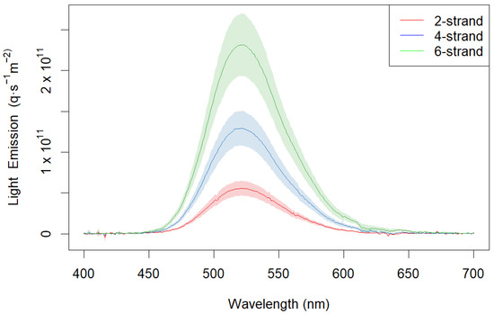 The absolute intensity measurements of the 6-strand twine resulted in a photon emission of (at 21 °C) 2.7 × 1013 q/m2/s across all wavelengths between 400 and 700 nm. When we apply the absolute intensity results of the 6-strand twine to the relative measurements of 4-strand and 2-strand twine, as described above, we obtain 1.5 × 1013 q/m2/s and 6.4 × 1012 q/m2/s, respectively. The peak wavelength in the absolute intensity measurement was the same as the relative measurement (523 nm). At the peak wavelength, 6-, 4-, and 2-strand light emission was 3.7 × 1011, 2.1 × 1011, and 9.6 × 1010 q/m2/s (Figure 2).