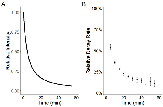 The optimized negative log-likelihood function produced decay results of S = 1.06 and = 1.16 for Equation (1). Decay rates show that initial intensity is reduced dramatically within the first 10 min and begins to reach an asymptotic-like stage after 30 min (Figure 3A). The decay rate results in Figure 3B show that the initial decay rate had a 54% reduction in light intensity after the first five min but was reduced to 36% following the next five-minute interval. With increasing time, the decay rate per five-minute interval began to reach an asymptote-like stage with increasing deviation around the mean.