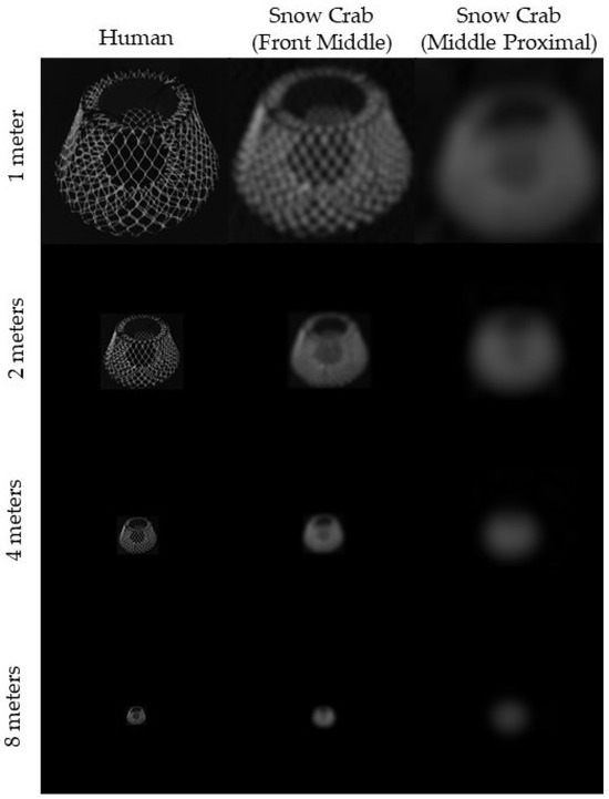 To our knowledge, this is one of the first published studies on the physical characteristics of snow crab eyes (see Meyers et al. [24]) and the first that estimates their visual capacity. Because of this lack of information on snow crab vision, we must either make assumptions or ignore factors that may affect the models. Additional research that would help inform the understanding of snow crab vision would include but is not limited to understanding the presence or degree of size/sex dependence on visual characteristics, temporal summation, neural superposition, screening pigments, polarization vision, opsin characterization and spectral sensitivity, contrast sensitivity, and dark- vs. light-adapted characteristics. Knowing how snow crab use posturing and eye movement to view their environment would also be beneficial.