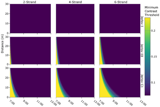 The only commercially available phosphorescent-netting pot in the Newfoundland and Labrador fishery, the 2-strand, is hardly visible to snow crab in Newfoundland-type waters (Jerlov III) during peak sunlight hours, significantly limiting the potential benefits of the light emission during this time. When the solar angle is low, the sighting distance is drastically diminished when medium or heavy turbidity is simulated in the BBL currents (Figure 7). Pots may be deployed after the maximum solar angle (about mid-day) to increase the contrast between the pots and the ambient light (Figure 8). Setting the pots at dusk would take advantage of the dramatic decrease in ambient light levels while emitting a significant amount of phosphorescent light in later hours, maximizing the contrast between the two light sources. Another way to further increase the contrast is to charge pots using UV lights on the boat before a night deployment. However, we cannot say a higher contrast would catch more snow crab without knowing why snow crab enter lit pots at higher rates. On the contrary, research suggests that the 4-strand pots outperform 6-strand pots with a 12% increase in adult male snow crab catch [55], suggesting that light attraction may be more nuanced than brighter means better.