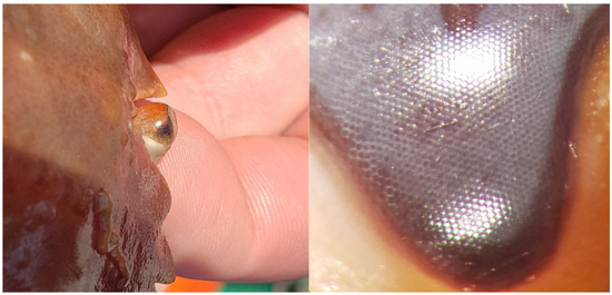 The distal portion of the eye appears to have screening pigments that fade dorsoventrally (Figure 9), as seen in fiddler crabs [65], suggesting that these screening pigments protect their eyes from stray light. These screening pigments could also allow for a degree of color discrimination in the dorsal part of the eye.