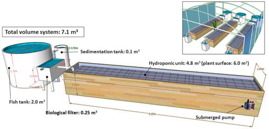Although the functioning of coupled freshwater systems is well described in the literature for a wide number of fish and plant species [,,,], most of the available literature describes the operation of these systems under optimal environmental conditions. The functioning of these systems with no control on air and water temperatures remains less explored in terms of fish and plant production outputs. Consequently, the objective of the current study was to evaluate the functioning and production of a coupled freshwater aquaponic system devoted to the combined production of flathead grey mullet and three varieties of lettuce (iceberg, romaine, and red leaf) under suboptimal water temperatures.