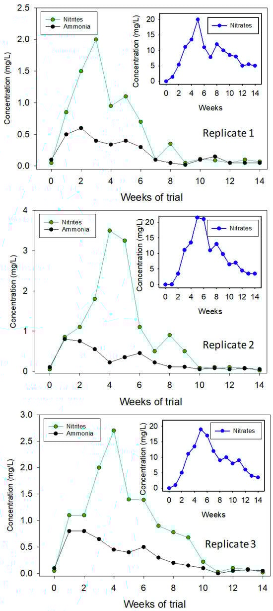 Weekly average values of ammonia, nitrites, and nitrates in the coupled aquaponic system farming flathead grey mullet (Mugil cephalus) and three varieties of lettuce (Lactuca sativa).