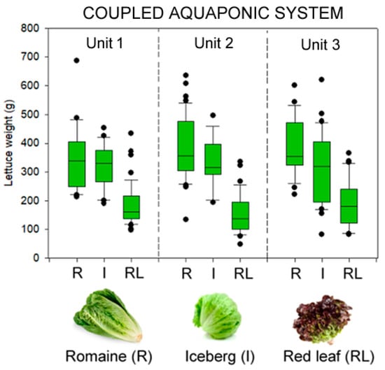 Box plot of the aerial weight (g) of the three varieties of lettuce (romaine, iceberg, and red leaf) grown in a coupled aquaponic system in combination with flathead grey mullet (Mugil cephalus). Data are shown for each independent unit that composed the aquaponic system.