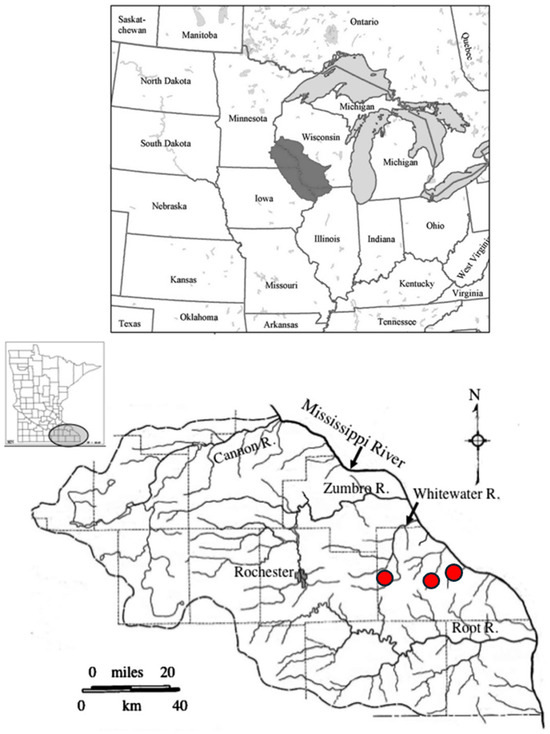 Maps indicating location of the study area within the upper midwestern USA (upper: Driftless Area Ecoregion highlighted in gray) and locations of the three study sites (lower: sites indicated by red dots) within the stream network of southeastern Minnesota (inset at middle left highlights southeastern Minnesota). Sites (left to right) were located on Trout Run, Garvin Brook, and Gilmore Creek.