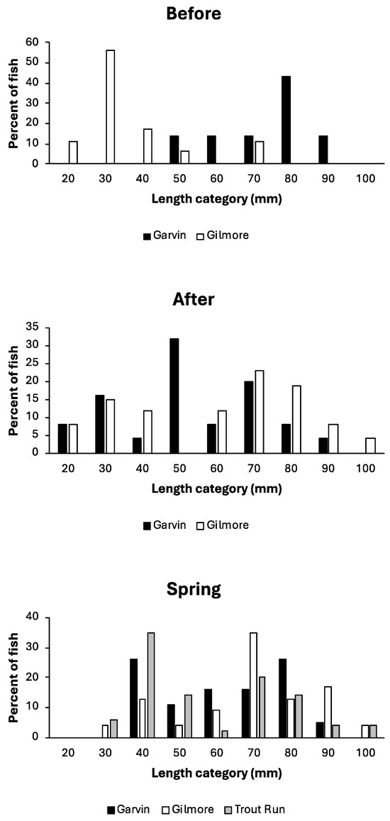 Slimy sculpin collected from three coldwater trout streams in Minnesota ranged in size from 25 to 101 mm TL and 0.1 to 18.0 g wet mass (Table 1). Neither sculpin length nor mass differed significantly among the three streams. Size distributions of sculpin (Figure 2) did not differ between/among streams after flooding (contingency table Chi-square = 11.9, df = 8, p = 0.156) or just prior to spawning the following spring (contingency table Chi-square = 17.4, df = 14, p = 0.238). However, size distributions of sculpin examined before flooding differed significantly (contingency table Chi-square = 19.2, df = 7, p = 0.008), with more small young-of-year sculpin and fewer adult sculpin in Gilmore Creek compared to Garvin Brook.