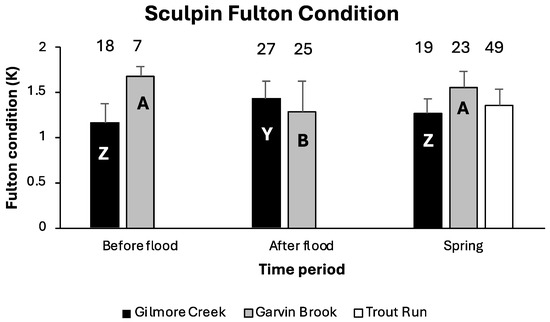 There were significant differences in sculpin Fulton condition among time periods within both Gilmore Creek (ANOVA F2,63 = 11.67, p < 0.0001) and Garvin Brook (ANOVA F2,54 = 9.29, p = 0.0004), but the pattern of change differed between streams (Figure 3). In Gilmore Creek, sculpin were in significantly better condition immediately after flooding compared with before flooding or prior to spring spawning (based on Tukey’s HSD). In contrast, sculpin in Garvin Brook were in significantly better condition before flooding and prior to spawning than they were immediately after flooding (based on Tukey’s HSD). The condition of sculpin in Trout Run prior to spring spawning was intermediate between those of fish from the other two streams (Figure 3).
