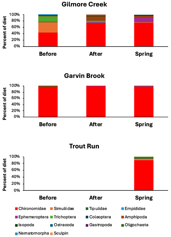 Diets of Garvin Brook sculpin before and after flooding were very similar (percent similarity index = 0.968), whereas those of Gilmore Creek sculpin were less similar (percent similarity index = 0.532) before versus after flooding. Additional diet percent similarity comparisons between time periods suggest that the diets of Garvin Brook sculpin remained very consistent throughout the study (before versus spring = 0.982, after versus spring = 0.972), whereas diets of Gilmore Creek sculpin were more variable (before versus spring = 0.505, after versus spring = 0.847).
