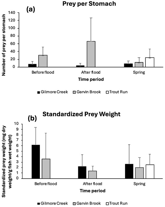 Mean (+one standard deviation) prey abundance per stomach (a) and standardized dry prey mass per fish (b) for slimy sculpin in southeastern Minnesota streams before and after August 2007 flooding and prior to 2008 spring spawning.