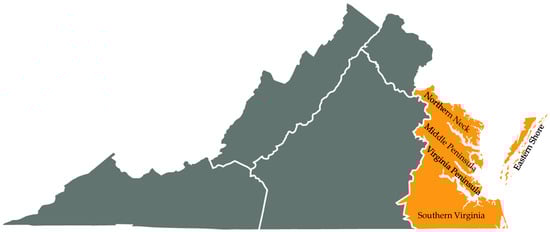As a “Mid-Atlantic” state, Virginia shares borders with Maryland, the District of Columbia, North Carolina, Tennessee, Kentucky, West Virginia, and the Atlantic Ocean. With a population exceeding eight million residents, Virginia boasted a gross domestic product of USD 561 billion in 2019, generated by 508 diverse industries that collectively sustain over 5.3 million jobs, USD 504.4 billion in personal income, and a total output of USD 929 billion [,]. The majority of seafood production occurs in Eastern Virginia, which encompasses five distinctive regions: the Northern Neck, the Middle Peninsula, the Virginia Peninsula, Southern Virginia, and the Eastern Shore (Figure 1). These regions are demarcated by the rivers Potomac, Rappahannock, York, and James, all of which interconnect with the Chesapeake Bay and the Atlantic Ocean.