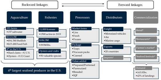 State agencies overseeing seafood and business activities keep records of the number of commercial licenses and permits held within the state. In Virginia, we obtained data from state agencies to validate the participation of businesses across various tiers of the seafood supply chain. This involved gathering information on the count of aquaculture farms, fishing licenses, distributors, processors, and other relevant entities. Furthermore, we requested detailed data on 2019 harvest landings. All the literature review and secondary data obtained from multiple sources were used to characterize the Virginia seafood supply chain and to produce a supply chain map [,,]. In some cases, secondary data were only available through a formal request and were not publicly accessible online. Additionally, our efforts included identifying any data gaps that are essential for performing an economic contribution analysis of the Virginia seafood industry.