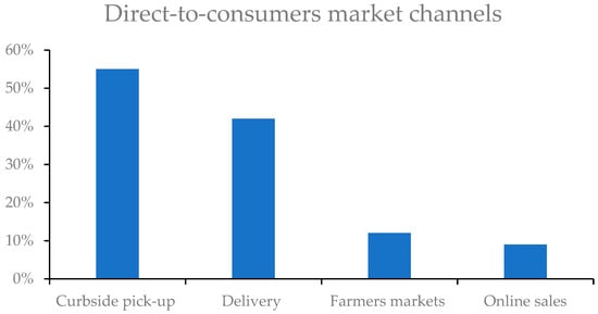 Among entities selling production directly to consumers, the most popular sales channels, as depicted in Figure 4, include curbside pickup (55%), delivery services (42%), farmers markets (12%), and online sales platforms (9%). For out-of-state seafood sales, respondents reported directing their products primarily to processors (9%), dealers (6%), and direct consumers (5%). Additionally, air freight and marine cargo emerged as distribution channels for 4% and 3% of respondents, respectively.