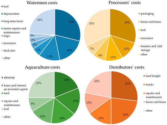 According to the survey responses, the primary costs for watermen businesses were as follows: fuel (29%), depreciation of boat, motor, vehicle, warehouse/office, and refrigerated truck (18%), long-term loans (13%), motor repairs and maintenance (6%), traps (4%), insurance (3%), and dock fees (3%). For aquaculture farms, the predominant costs included electricity (19%), loans and interest on invested capital (17%), feed (16%), repairs and maintenance (14%), and fuel (9%). Processors’ costs were largely concentrated in packaging supplies (30%), leases and loans (12%), fuel (11%), insurance (8%), freezers and cold storage (7%), advertising and marketing (5%), and repairs and maintenance (4%). Similarly, distributors’ costs were focused on land freight (27%), trucks (23%), repairs and maintenance (15%), and leases and loans (13%). Figure 5 summarizes the primary costs for watermen, aquaculture farms, processors, and distributors.