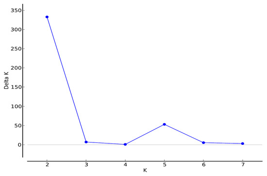 - Evanno, G.; Regnaut, S.; Goudet, J. Detecting the Number of Clusters of Individuals Using the Software STRUCTURE: A Simulation Study. Mol. Ecol. 2005, 14, 2611–2620. [Google Scholar] [CrossRef] [PubMed]