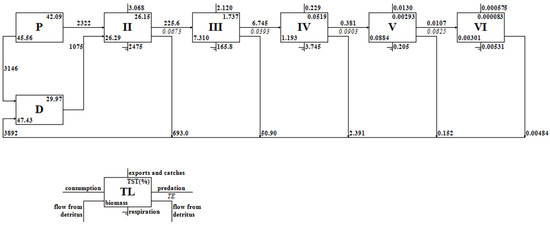 | Trophic Level | Import | Export | Consumption by Predators | Flow to Detritus | Total Throughput |