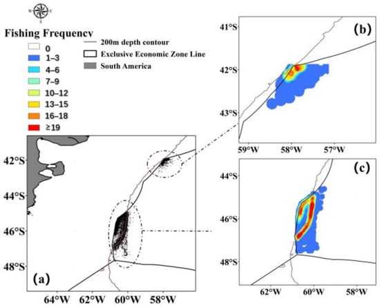 Statistics (a) and heatmap (b,c) of operational data points for Illex argentinus high seas trawl fishing grounds ((b) is northern fishing ground and (c) is southern fishing ground).