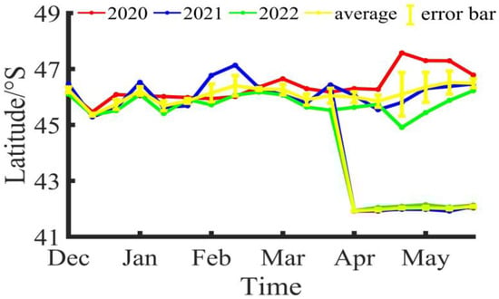 The latitude variation of the fishing center for Illex argentinus trawl grounds.