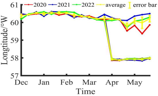 During the fishing season of Illex argentinus in the Southwestern Atlantic from 2020 to 2022, the longitude and latitude variations of the fishing center of trawl vessels are shown in Figure 2 and Figure 3. Based on the three-year average, the fishing operation center of the southern fishing grounds was at 60°23′ W, 46°15′ S in Dec/B, moved to 60°26′ W, 45°22′ S in Dec/M, and shifted to 60°32′ W, 45°44′ S in Dec/E; the fishing operation center in Jan/B was at 60°29′ W, 46°13′ S, moved to 60°32′ W, 45°41′ S in Jan/M, and was located at 60°32′ W, 45°52′ S in Jan/E; in Feb/B, the fishing operation center was at 60°32′ W, 46°8′ S, moved to 60°23′ W, 46°25′ S in Feb/M, and was positioned at 60°22′ W, 47°17′ S in Feb/E; in Mar/B, the fishing operation center was at 60°2′ W, 46°16′ S, moved to 60°1′ W, 45°55′ S in Mar/M, and was located at 60°14′ W, 46°3′ S in Mar/E; in Apr/B, the fishing operation center was at 60°1′ W, 46°0′ S, moved to 60°10′ W, 45°51′ S in Apr/M, and was positioned at 59°47′ W, 46°1′ S in Apr/E; in May/B, the fishing operation center was at 60°5′ W, 46°21′ S, moved to 59°39′ W, 47°11′ S in May/M, and was located at 60°13′ W, 46°29′ S in May/E. Overall, the southern fishing grounds show a trend of decreasing longitude and increasing latitude during the fishing season, shifting towards the southeast direction. For the northern fishing grounds, trawl vessels did not start operations until April. In Apr/B, the fishing operation center was at 57°55′ W, 41°55′ S, moved to 57°53′ W, 41°58′ S in Apr/M, and was positioned at 57°55′ W, 42°2′ S in Apr/E; in May/B, the fishing operation center was at 57°55′ W, 42°2′ S, moved to 57°54′ W, 42°1′ S in May/M, and was located at 57°59′ W, 42°5′ S in May/E. Compared to the southern fishing grounds, the position of the northern fishing grounds is relatively stable, mainly fluctuating around 57°55′ W, 42°0′ S.