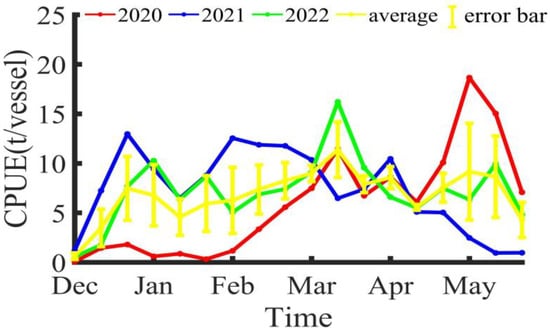 The CPUE within the Illex argentinus trawl fishing grounds, as shown in Figure 4, varies each year but also demonstrates common trends. At the start of the fishing season, the CPUE shows an upward trend, reaching a peak around Mar/M. From the middle ten days of March to the middle ten days of April, the CPUE shows a downward trend, before rising again after the middle ten days of April.