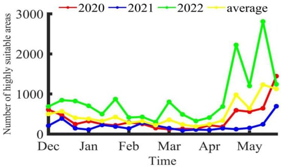 Trend of changes in the number of highly suitable areas for Illex argentinus trawl fishing grounds.