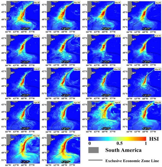 Using the Maxent model, the potential habitat distribution of Illex argentinus trawl fishing grounds was simulated for each ten-day period. The number of 0.1° × 0.1° areas with an HSI greater than 0.6 (indicating highly suitable areas) was counted, with the results shown in Figure 5. These HSI results from the Maxent model were then visualized using ArcGIS 10.2, calculating the averages over three years, as presented in Figure 6. From 2020 to 2022, during the fishing season, the trawl fishing grounds exhibit a band-like distribution, primarily concentrated between 58°48° S. Initially, at the start of the fishing season, the highly suitable areas for trawl fishing are concentrated around the 60° W, 45° S exclusive economic zone line, continuing until Feb/E. Simultaneously, the most suitable areas for trawl fishing gradually extend along the exclusive economic zone line both northward and southward. Since Chinese trawl vessels operate exclusively outside the exclusive economic zone line, the operation center remains between 45° S~47° S and 60° W~61° W, without moving northward. By April, as the highly suitable areas extend beyond the 42° S exclusive economic zone line, some Chinese trawl vessels start to operate in this area, forming three distinct fishing grounds: a northern ground near the 42° S exclusive economic zone line, a central ground east of the 45° S exclusive economic zone line, and a southern ground near the 47° S exclusive economic zone line.
