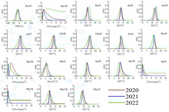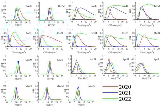 Based on the determination of key environmental factors in each ten-day period, we utilized MATLAB software to visualize the DAT format data exported from the MAXENT model, as shown in Figure 7 and Figure 8. By analyzing the response of the Illex argentinus trawl fishing grounds’ HSI to the key environmental factors in each ten-day period, we determined the optimal ranges for two key environmental factors during the fishing season over the three years, as summarized in Table 2. The accuracy of the fitting results is presented in Table 3, with precision exceeding 0.95 for each time period.