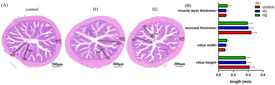 No significant changes were observed in the intestines of the largemouth bass after the hydrogen was injected (Figure 1A), with no differences being observed in muscle layer thickness, mucosal thickness, villus width, and villus height between the treatment groups (H1 and H2) and the control (Figure 1B, p > 0.05).