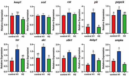 The expression of keap1 decreased significantly after injecting the bass with H2 hydrogen compared with the control (Figure 2, p < 0.05). The expressions of pk, pepck, tor, akt, s6k1, 4ebp1, and ampka increased significantly after injecting the bass with H1 hydrogen compared with the control (p < 0.05). The expressions of keap1, sod, and cat showed an increasing trend in H1.