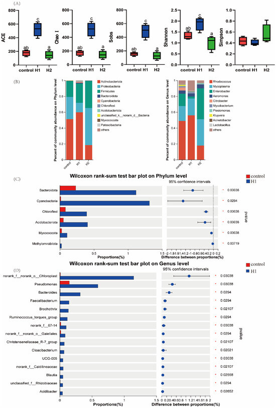The abundances of Bacteroidota, Cyanobacteria, Chloroflexi, Acidobacteriota, Myxococcota, and Methylomirabilota at the phylum level in H1 were significantly higher than those in the control group (Figure 3C, p < 0.05). The abundances of Pseudomonas, Bacteroides, and Faecalibacterium and so on at the genus level in H1 were significantly higher than those in the control group (Figure 3D, p < 0.05).