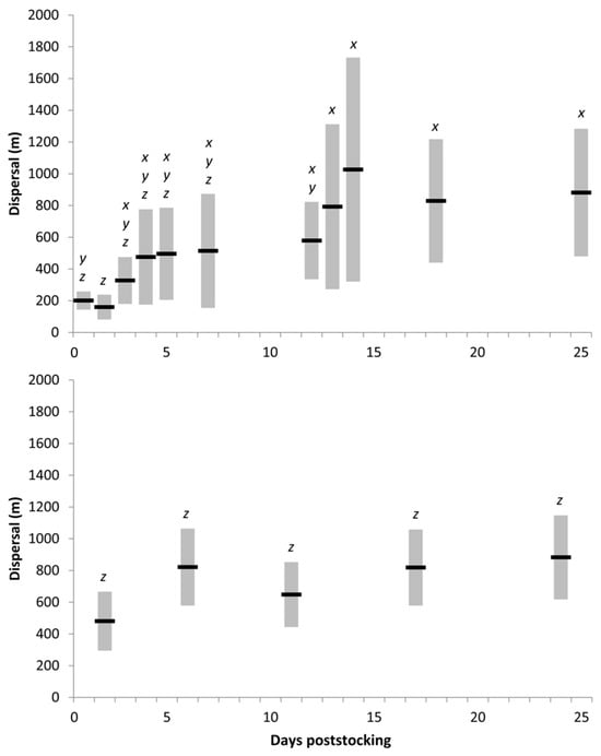 31]. Muskellunge stocked in the fall in two northern Wisconsin lakes dispersed rapidly after a short recovery period of 1 DPS and selected nearshore, shallow (<3.1 m), vegetated areas up to 34 DPS. Those stocked in the spring, however, varied substantially in their dispersal and movement patterns within the first 10 DPS, with fish stocked in May exhibiting lower dispersal rates than those stocked in late June [