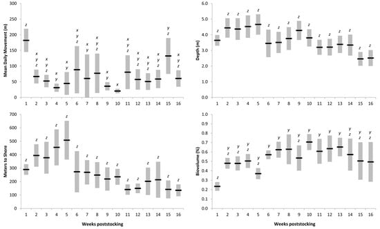 Data analysis—Fish dispersal, movement, proximity to shore, and depth were natural logarithm transformed, and an arcsine transformation was used for SAV biovolume data to meet data normality assumptions. The effects of lake, week poststocking, and the lake×week poststocking interaction term on Muskellunge movement, proximity to shore, depth usage, and SAV biovolume were determined using repeated-measures analysis of variance (ANOVA; with a first-order autoregressive covariance structure [