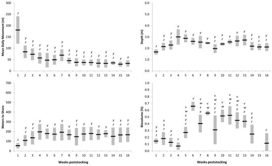−1) for individual fish were calculated by dividing the minimum in-water, straight-line distance traversed between tracking events by the number of lapsed days. If the number of lapsed days between two consecutive individual fish detections was ≥14 days or the fish was determined to be dead, daily movement rates were excluded from the analyses. Daily movement rates observed within the first seven DPS were pooled by lake to examine mean movement rates within the first week poststocking. Subsequent mean daily movement rates were calculated and pooled by each week poststocking to examine the movement behavior of Muskellunge throughout the study.