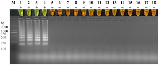 2.8. Sensitivity Detection of the Triple LAMP Reaction