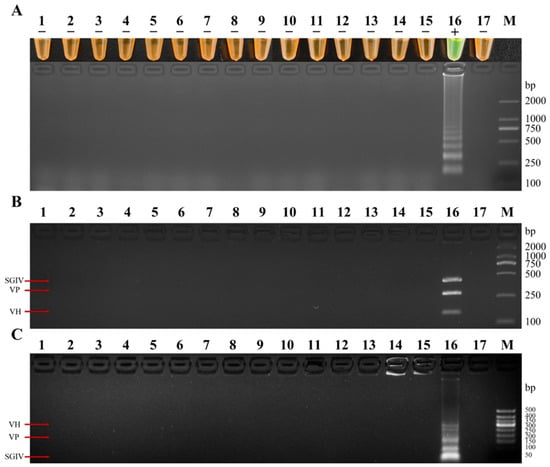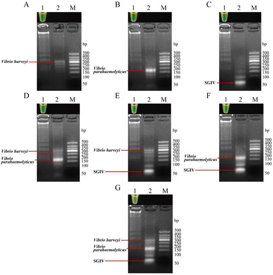 Li, T.; Ding, R.; Zhang, J.; Zhou, Y.; Liu, C.; Cao, Z.; Sun, Y. The Establishment of the Multi-Visual Loop-Mediated Isothermal Amplification Method for the Rapid Detection of Vibrio harveyi, Vibrio parahaemolyticus, and Singapore grouper iridovirus. Fishes 2024, 9, 225. https://doi.org/10.3390/fishes9060225