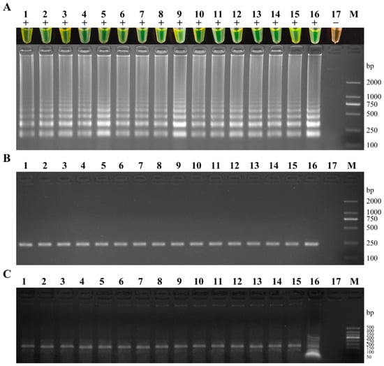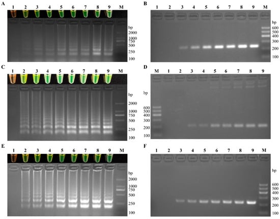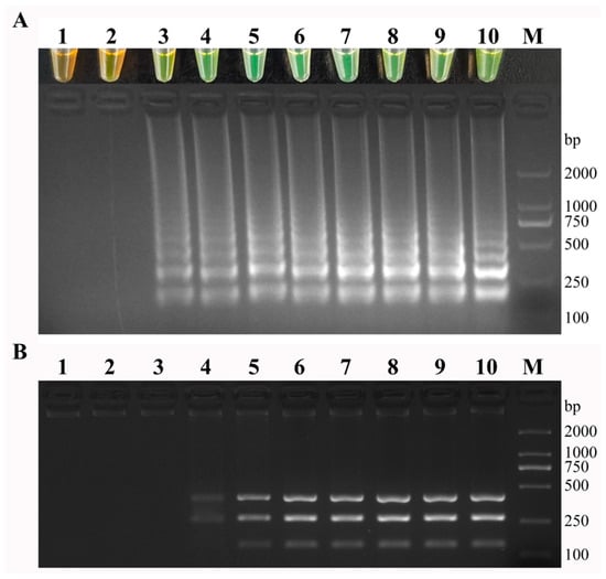 - Fan, Q.; Xie, Z.X.; Wei, Y.; Zhang, Y.F.; Xie, Z.Q.; Xie, L.J.; Huang, J.L.; Zeng, T.T.; Wang, S.; Luo, S.S.; et al. Development of a visual multiplex fluorescent LAMP assay for the detection of foot-and-mouth disease, vesicular stomatitis and bluetongue viruses. PLoS ONE 2022, 17, e0278451. [Google Scholar] [CrossRef]
